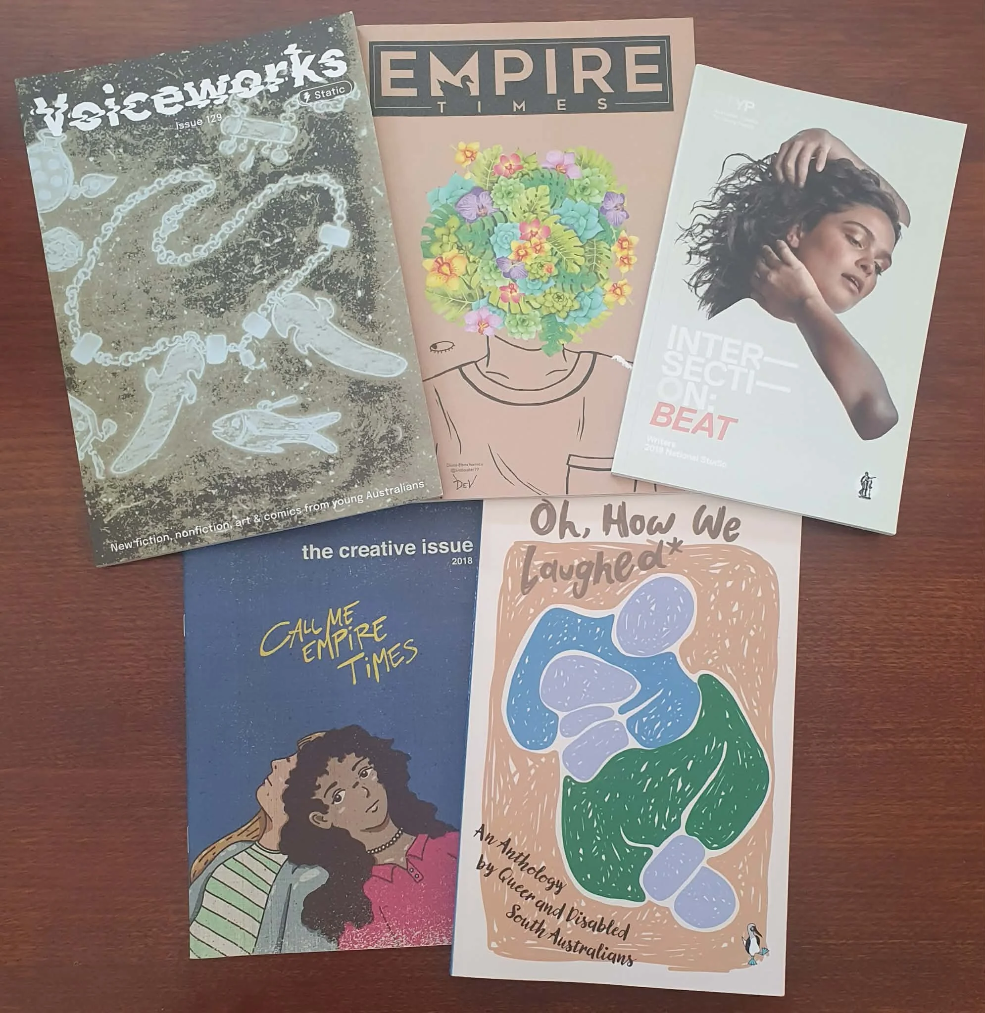 Pictured (left to right): Voiceworks Issue #129 “Static”, Empire Times Issue 1 Volume 46, “Intersection: Beat” by ATYP, Empire Times Creative Issue Volume 45 and Oh, How We Laughed* by Buon Cattivi Press.